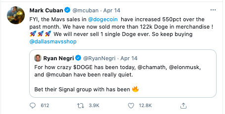 Además, un grupo de celebridades extranjeras también ha comenzado a promocionar DOGE. Por ejemplo, el propietario multimillonario de los Dallas Mavericks, Mark Cuban (Mark Cuban), tuiteó: "Actualmente hemos recibido 122,000 DOGE a través de la venta de mercancías. Nunca venderemos DOGE, así que siga comprando".