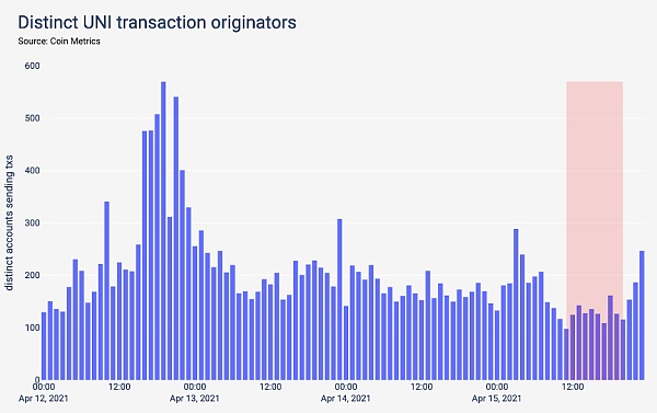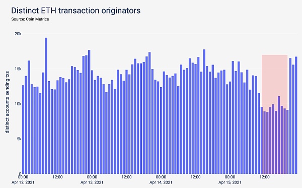 Algunos tokens ERC-20 también se vieron afectados por la interrupción. Entre ellos, USDC fue uno de los tokens más afectados, y la cantidad de originadores de transacciones se redujo significativamente durante la interrupción: