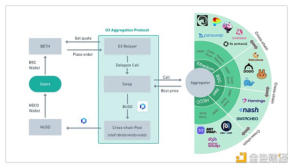 El sistema de agregación de cadenas cruzadas consta de agregadores O3 en cada cadena de bloques para ayudar a los usuarios a encontrar la ruta de transacción y el precio efectivo y de mejor calidad en la red de transacciones correspondiente.