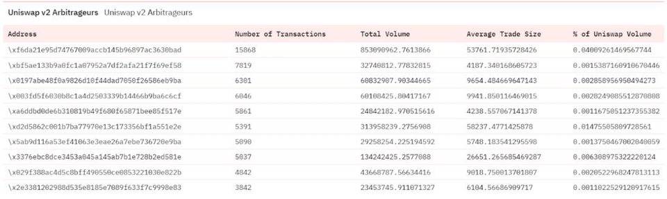 Aunque es demasiado pronto para juzgar, como regla general, podemos ver el volumen de negociación de los 10 principales arbitrajistas en Uniswap V3 y V2. Cuanto más profesional sea la creación de mercado de LP, menos actividades de arbitraje y menos pérdidas de los proveedores de liquidez. Lo contrario es cierto si hay una gran cantidad de arbitraje.