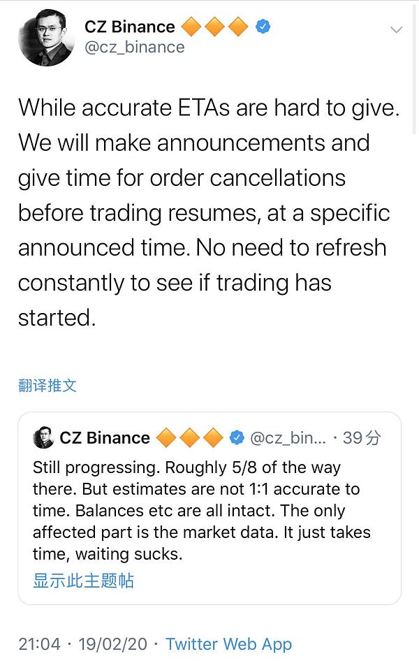 CZ tuiteó sucesivamente: mantenimiento no planificado del sistema, suspensión de transacciones, trabajando duro. No se pierde ni se corrompe ningún dato (excepto los datos de mercado) y debe repararse lo antes posible. Los futuros seguirán funcionando bien. Los fondos están seguros y no hay necesidad de entrar en pánico. El trabajo de mantenimiento aún está en progreso y está completo en aproximadamente 5/8, pero no se pueden garantizar los tiempos exactos. Los fondos de los usuarios, etc., están intactos, lo único afectado son los datos del mercado. Esperar apesta.
