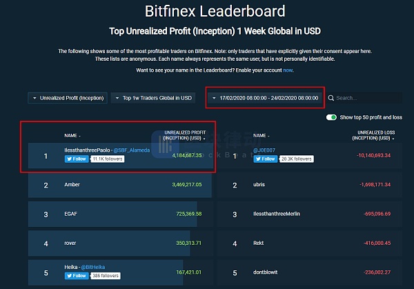 (Nota de BlockBeats: la imagen de arriba es la tabla de clasificación de Bitfinex del 10 al 17 de febrero)