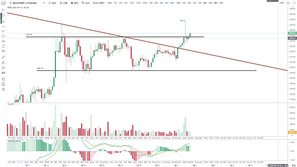 BSV también rompió el borde superior de la caja oscilante reciente. Después del avance, la posición larga no pudo continuar y no se formó un mercado independiente. La tendencia general todavía está vinculada con el aumento. La zona de presión reciente arriba está entre 190- 200, que también es un área de consolidación para el declive anterior., esta posición tiene un avance efectivo, y el volumen puede cooperar, y será alcista por encima de los 210 dólares estadounidenses. Aunque el volumen actual difícilmente puede romperse al mismo tiempo, pero en la actual mejora general a corto plazo en el mercado, la probabilidad de continuar aumentando después de que pase el impacto es alta, y el soporte es de 170 dólares.