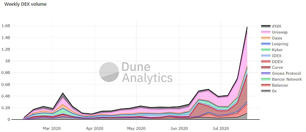 Tomando la ruta DEX como ejemplo, el volumen total de transacciones en julio alcanzó los 4200 millones de dólares estadounidenses, mientras que el volumen total de transacciones de DEX el año pasado fue de solo 2400 millones de dólares estadounidenses. Entre ellos, los proyectos estrella Uniswap y Curve Finance son aún más locos. El volumen diario de transacciones superó la marca de 100 millones de dólares estadounidenses en julio, y el volumen diario de transacciones de Curve Finance una vez superó los 150 millones de dólares estadounidenses.