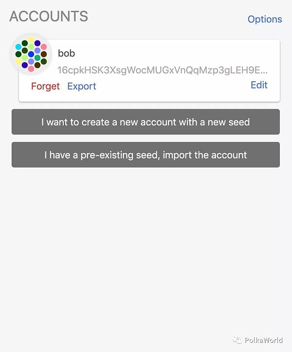 5. En este punto, se crea su dirección de Polkadot. El formato de dirección de la red principal de Polkadot debe comenzar con "1". Si el suyo no lo es, haga clic en el botón "Opción" en la esquina superior derecha y seleccione "Polkadot (en vivo)" para mostrar la dirección de la red principal de Polkadot. Los formatos de dirección de cadena basados en sustrato se pueden convertir entre sí.