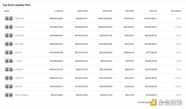 Desde enero, el volumen de transacciones de sushiswap se ha mantenido en torno a los 3.000 millones de dólares estadounidenses en un solo día. En la actualidad, no hay datos totales para los ingresos de un solo día. Solo podemos ver las estadísticas de un solo par comercial de la clasificación de pares comerciales. Los datos se muestran en la figura a continuación. Se puede ver que los ingresos por tarifas dentro de 24 horas y 7 días es muy alta.