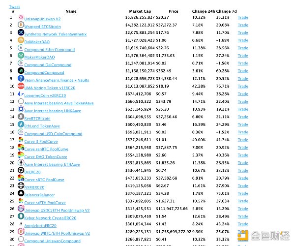 Entre los principales dexes en los intercambios, la mayoría de las transacciones también provendrán de pares comerciales de divisas estables. Como se muestra en la figura a continuación, dai ocupa el cuarto lugar en el ranking de valor de mercado de tokens defi. Como moneda estable, la generación de dai It se emite a través de activos hipotecarios, lo que es suficiente para probar la amplia aplicación e importancia de dai.